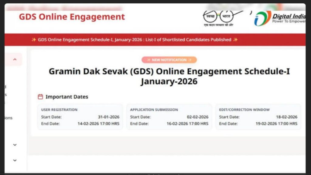 इंडिया पोस्ट इस केंद्रीकृत प्रक्रिया को इंडिया पोस्ट GDS ऑनलाइन एंगेजमेंट पोर्टल के ज़रिए संचालित करता है। जिन उम्मीदवारों ने इंडिया पोस्ट GDS कट ऑफ़ 2026 को पूरा किया है, लेकिन जिनका चयन पहले नहीं हुआ था, उन्हें अब इस लिस्ट में शामिल किया जा सकता है। मेरिट लिस्ट में शॉर्टलिस्ट किए गए सभी उम्मीदवारों के रजिस्ट्रेशन नंबर, नाम और डॉक्यूमेंट वेरिफिकेशन से जुड़े निर्देश दिए जाएँगे।